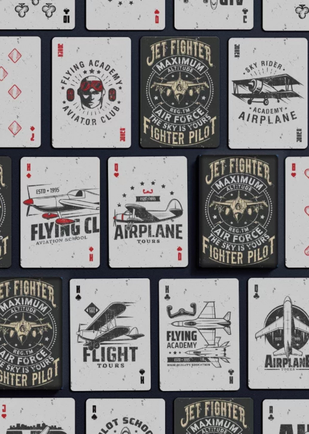Jet Fighter Playing Cards feature a vintage-style Aviation-themed design celebrating aviation and fighter pilots, with the slogan "The Sky Is Yours", "Fighter Pilot" on the tuck box. The Joker card in the deck also follows this theme, displaying a "Flying Academy Aviator Club" design.